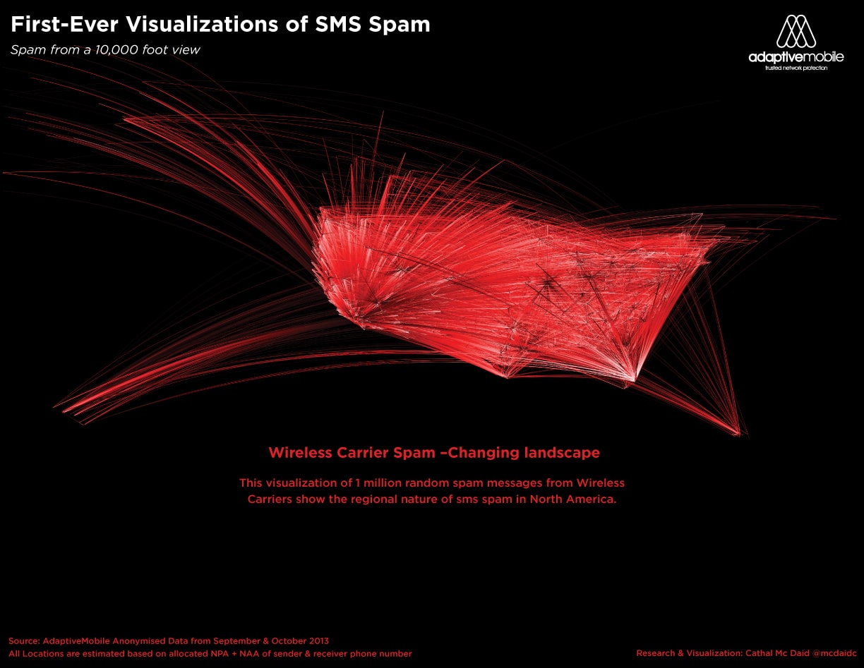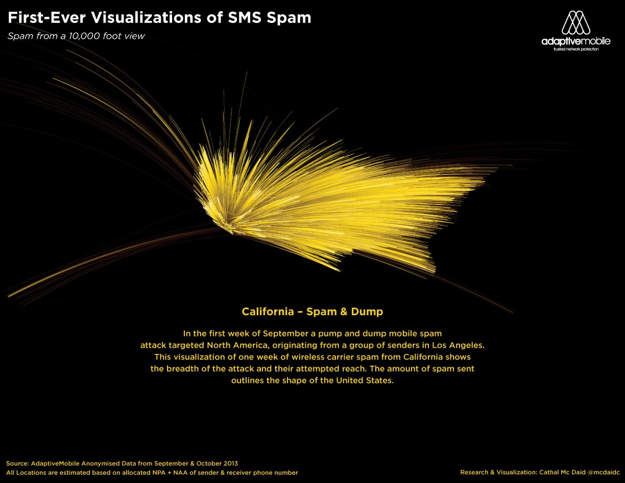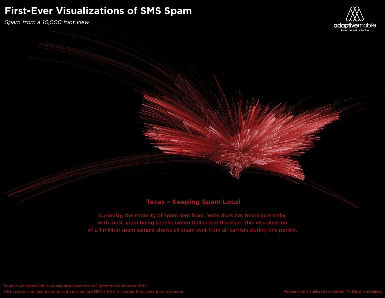 Dallas – December 4, 2013 – AdaptiveMobile, the leader in mobile security, today issued an industry-first snapshot of SMS traffic across the United States, which shows ground-breaking visualizations of text messaging spam based on the mobile phone’s geographical location, as well as the industry’s first comprehensive map of the sources and targets of mobile spam in the United States. This two-month snapshot shows that mobile phones in South Florida, Dallas and Chicago were targeted with the highest levels of SMS spam. During this period, Los Angeles generated the most spam in the United States and was responsible for a pump-and-dump scam which “exploded” across the United States. South Florida was the next highest generator, hammering the Miami area with a “Junk Car” spam campaign.