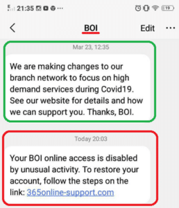 1) First of the all, the target receives a SMS text message purporting to be from BOI (Bank of Ireland). This screenshot contains an SMS text message telling the subscriber they need to log on to a banking website that looks similar to the ‘real’ BOI online banking website www.365online.com. Note the first covid19-related message at the top – this is actually a real communication from the bank, and we will come back to this later.